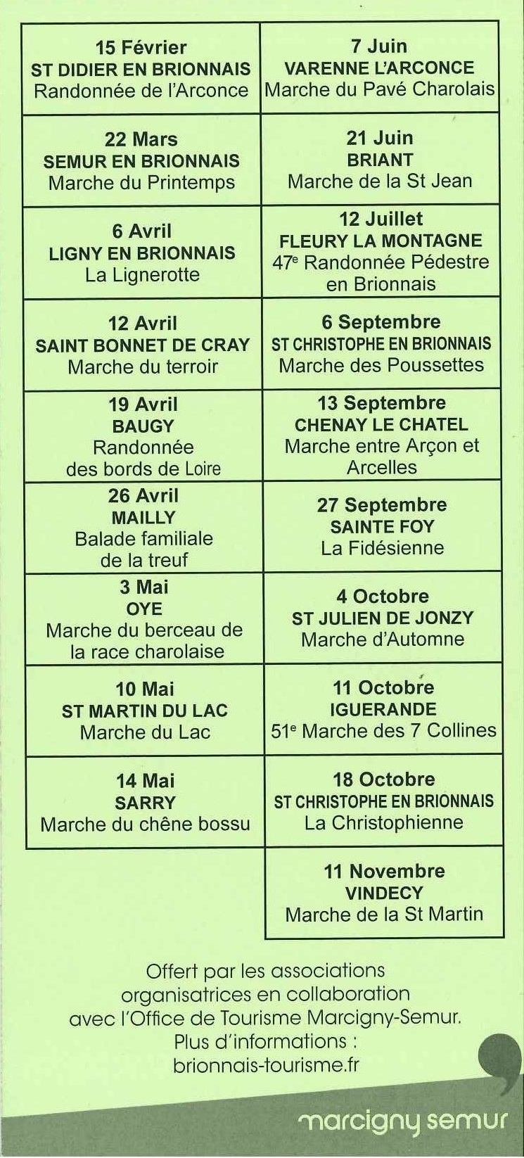 Calendrier 2026 des randonnées pédestres autour de Marcigny & Semur en Brionnais